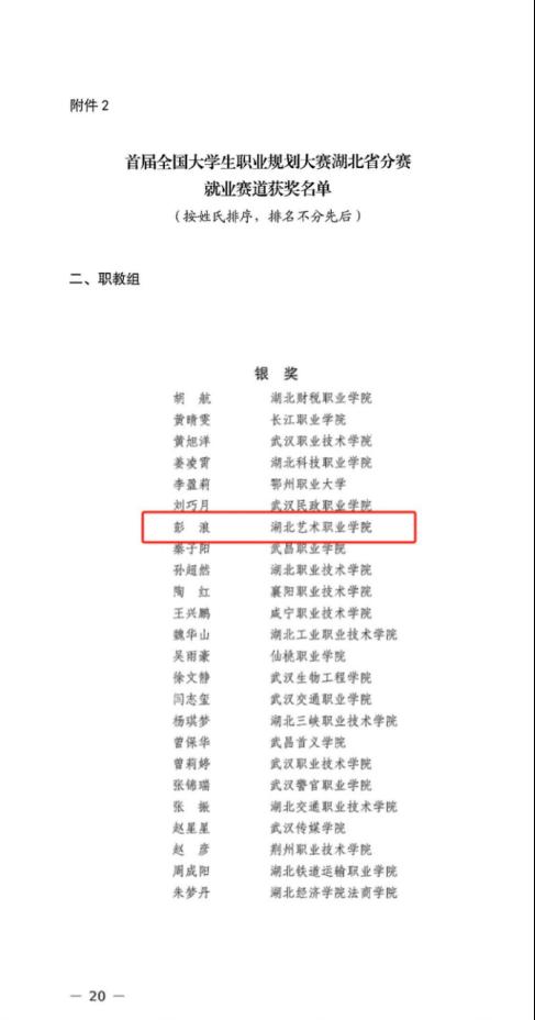 比赛中,选手们精心准备、倾情展示,立足国家战略需求,致力于基层教育事业和非物质文化遗产传承,秉承“明德、精艺、尚美、拓新”的校训,发扬大国工匠精神,经过激烈角逐,彭浪荣获职教组就业赛道银奖,胡恒升荣获职教组成长赛道铜奖。