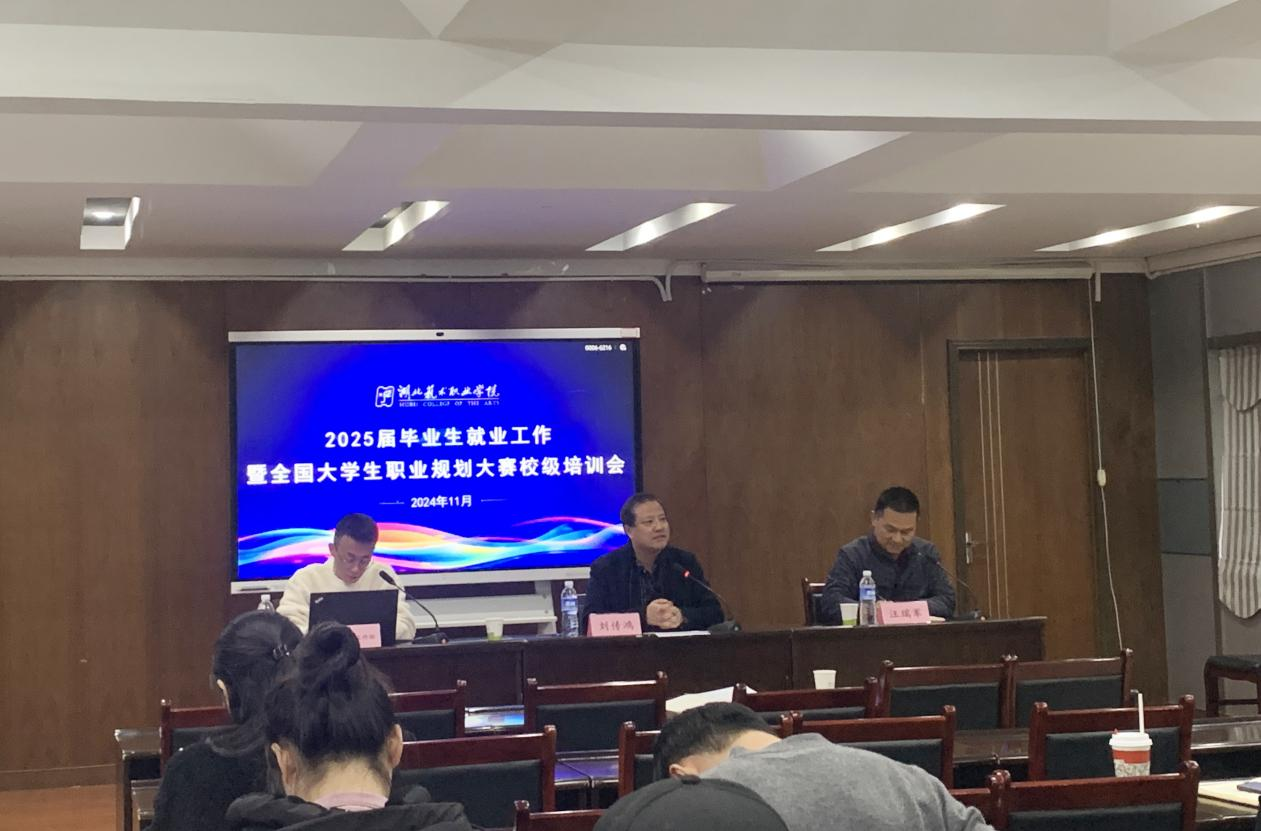 为深入学习贯彻党的二十届三中全会精神和全国教育大会精神,组织开展好2025届高校毕业生“秋季校园招聘月”系列活动暨第二届全国大学生职业规划大赛。11月20日下午,学校在虎泉校区六楼报告厅召开2025届毕业生就业工作暨全国大学生职业规划大赛校级培训会。校党委委员刘传鸿出席会议并讲话,各二级学院党总支书记、院长、副书记以及全体毕业班辅导员参加会议。会议由党委学生工作部部长汪瑞军主持。