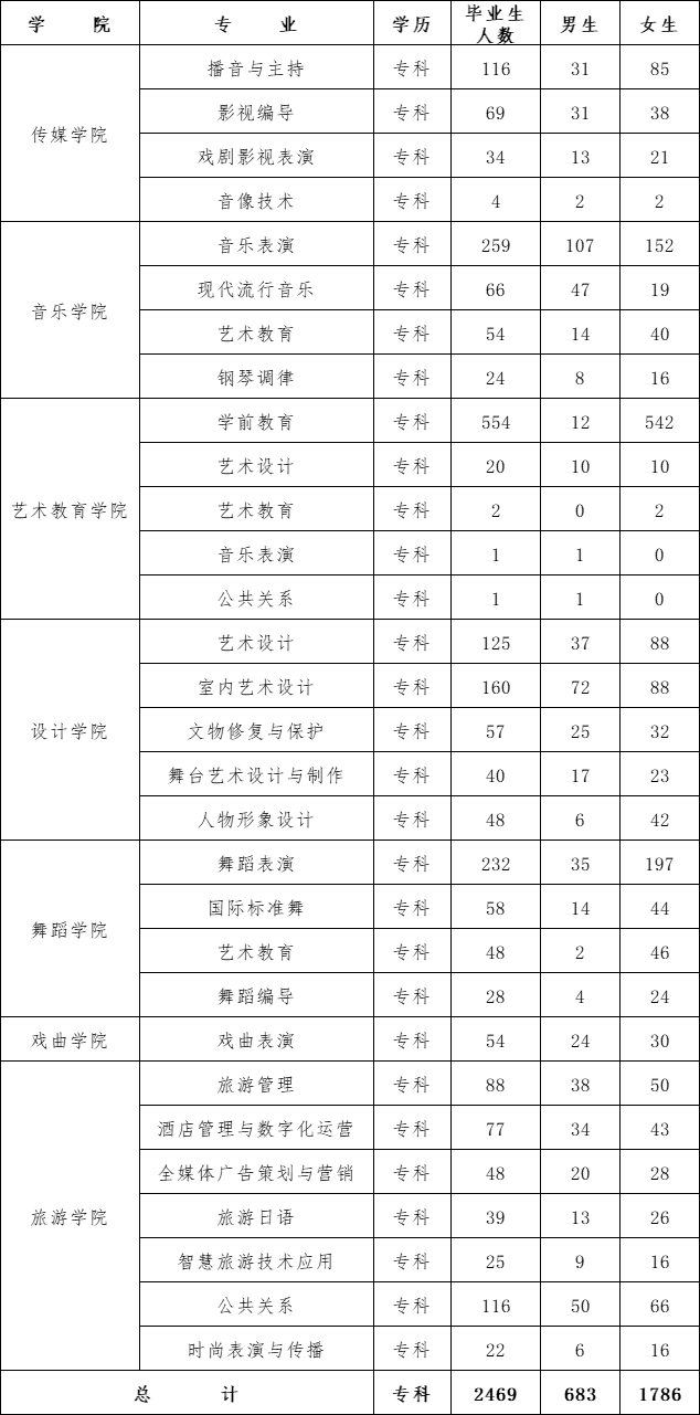 学校2024届毕业生共2469人,其中艺术教育学院578人、传媒学院223人、设计学院430人、音乐学院403人、舞蹈学院366人、戏曲学院54人、旅游学院415人。